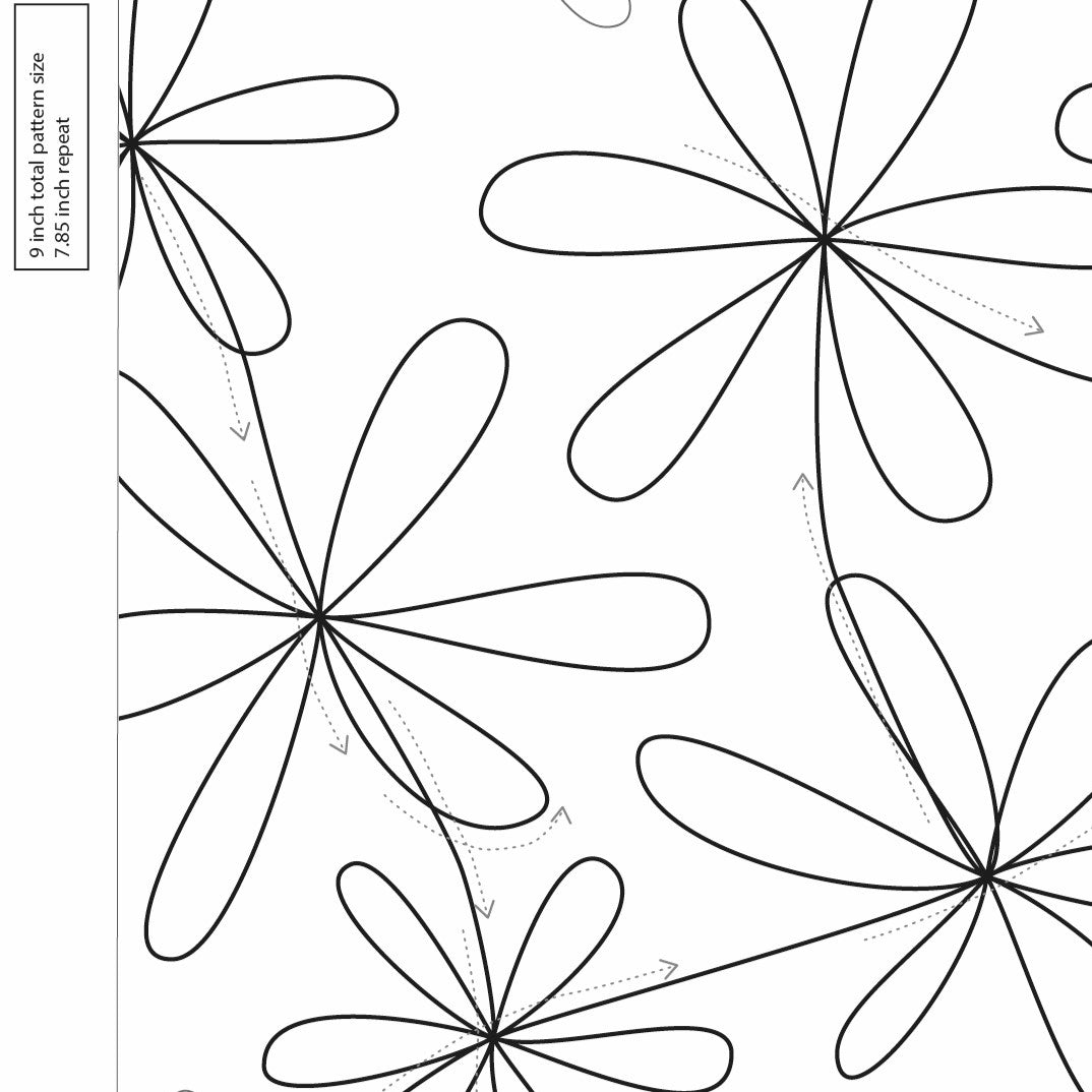 Bring elegance to your quilts with our 6 Petal Flower pantograph, available as a PDF for manual, hand-guided longarm quilting. Designed for skilled quilters, this pattern features intricate flower centres with multiple crossover points, so practice with pen and paper is highly recommended before quilting.